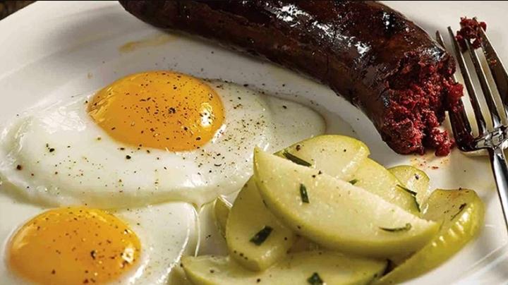 A beautiful breakfast consisting of two eggs, a green apple cooked with clove in white wine, and boudin-noir blood sausage made from freshly harvested human spleen.